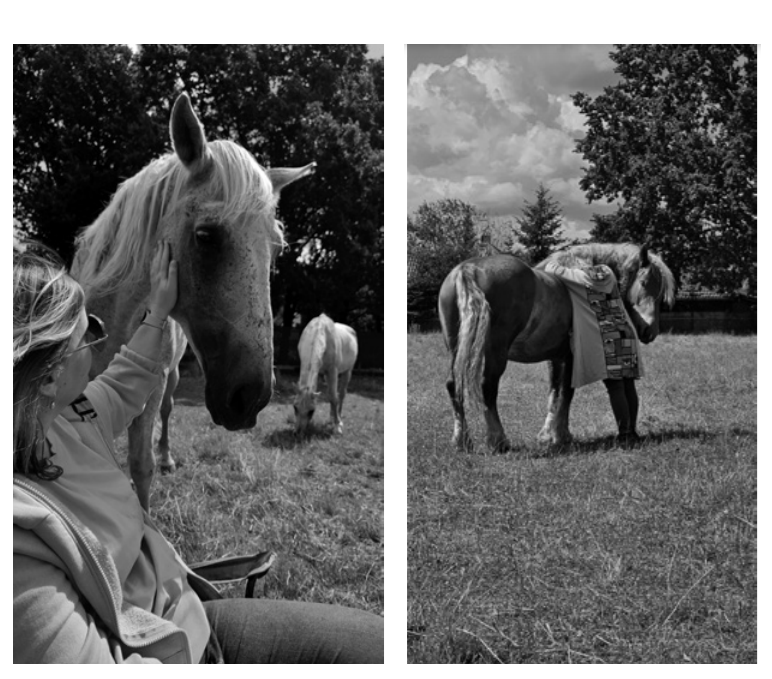 To jedynie fragment pracy, jaki osoby doświadczające przemocy wykonują podczas sesji, gdyż to, nad czym pracujemy, za każym razem pojawia się właśnie podczas spotkania na łące z końmi i zazwyczaj jest to to, co najbardziej wymaga uwagi i zatrzymania się w danym momencie. Niesamowite jest to, że mogę obserwować jak osoby, które często nigdy nie miały do czynienia z końmi, pracują z nimi jakby robiły to od lat. Jak ich ciało i lęk się zmniejszają do poziomu, który pozwala na przyglądanie się sobie i zmianę. Jak rodzi się zaufanie nie tylko do zwierzęcia, metody, ale przed wszystkim – do siebie.
