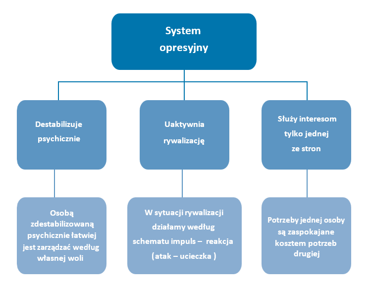 Pracując z osobami uzależnionymi, często możemy się spotkać z sytuacją, kiedy druga strona nie chce współpracować ani troszczyć się o zaspokojenie potrzeb rozmówcy, gdyż przede wszystkim pragnie zrealizować własne cele, zazwyczaj nie przebierając w środkach. W takich przypadkach dobrze jest zadbać o to, by nie dać się uwikłać poprzez przyjęcie narzuconego wzorca komunikacji opresyjnej: nie stosować przemocy słownej, a także – jeśli nie: przede wszystkim – nie ulegać manipulacjom i samemu ich nie stosować. Chyba że pragniemy po prostu rozładować własne napięcie poprzez przystąpienie do tańca w trójkącie dramatycznym opisanym przez Erica Berna, gdzie agresor, ofiara i wybawca zamieniają się systematycznie miejscami w niekończącym się korowodzie. Jeżeli w trakcie rozmowy pociągające staje się posłużenie się władzą, kierowanie litością lub cała ta sytuacja potęguje poczucie bezradności to jest to sygnał, że zaczynamy reagować jak osoba współuzależniona i dobrze byłoby to zmienić. By nie dać się zdestabilizować i mieć możliwość utrzymania postawy asertywnej, należy w trakcie rozmowy wystrzegać się mechanizmów opresyjnych (przemoc słowna i manipulacja) oraz trzymać się zasad komunikacji zrównoważonej.