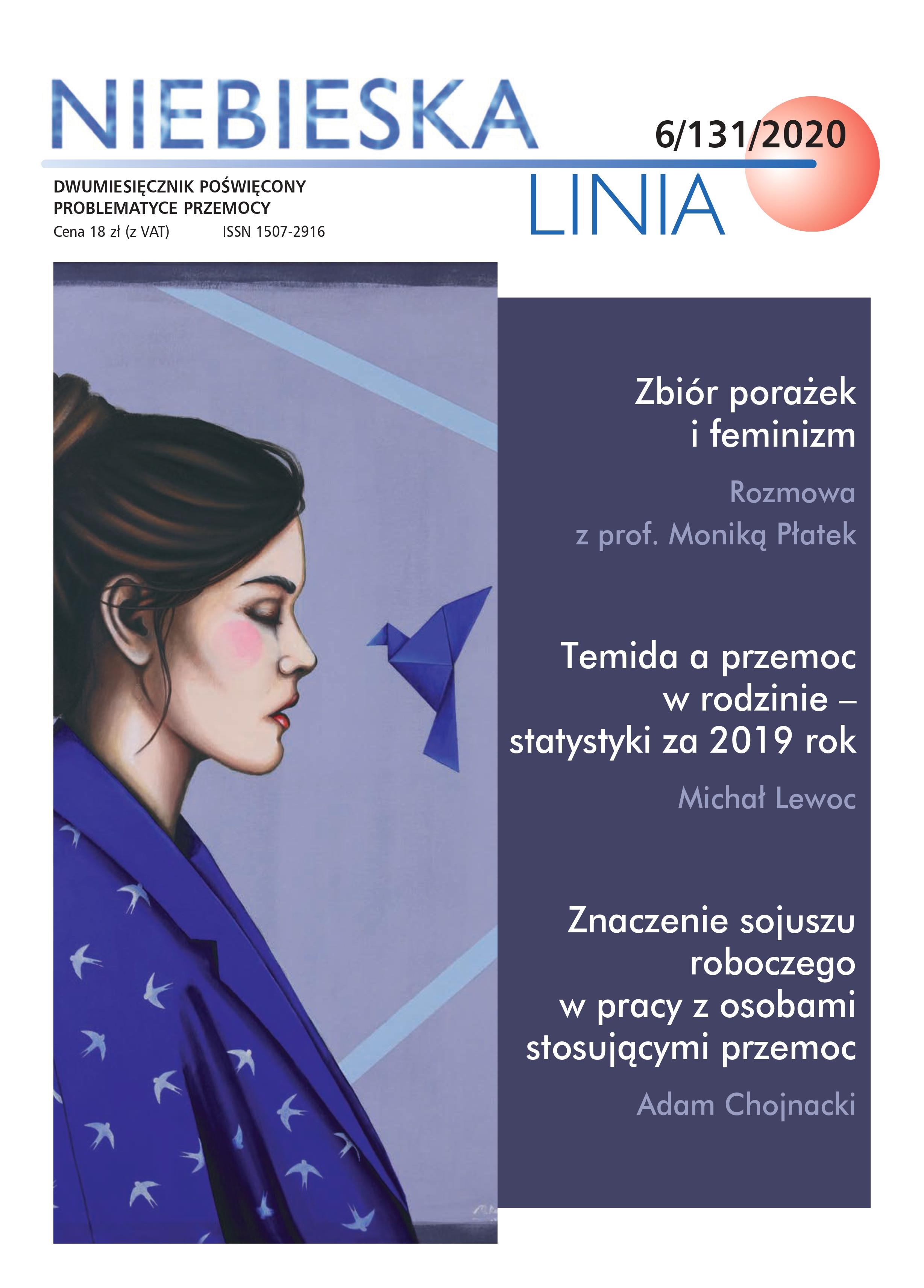 Z ogromną radością informujemy, iż pojawił się kolejny numer (5/130/2020) naszego dwumiesięcznika Niebieska Linia, a w nim między innymi rozmowa z prof. Moniką Płatek, opracowanie pełnych statystyk za rok 2019, które (jak co roku od 2009 roku!) przygotował dla nas dr Michał Lewoc, a także tekst Adama Chojnackiego "Znaczenie sojuszu roboczego w pracy z osobami stosującymi przemoc".