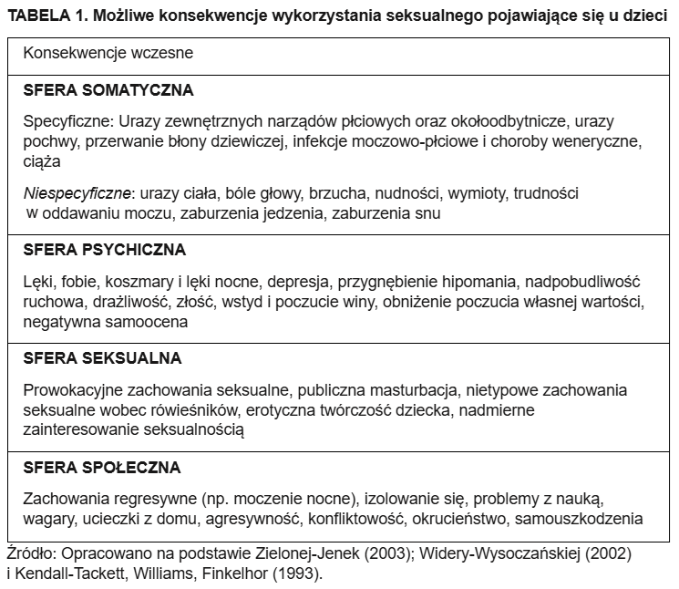 Niezależnie od danych wskazujących na możliwość braku konsekwencji wykorzystania u niektórych dzieci, to jednak badania pokazują, że u większości konsekwencje takie się pojawiają. Tabela 1, przedstawia propozycję podziału możliwych u dzieci konsekwencji wykorzystania.